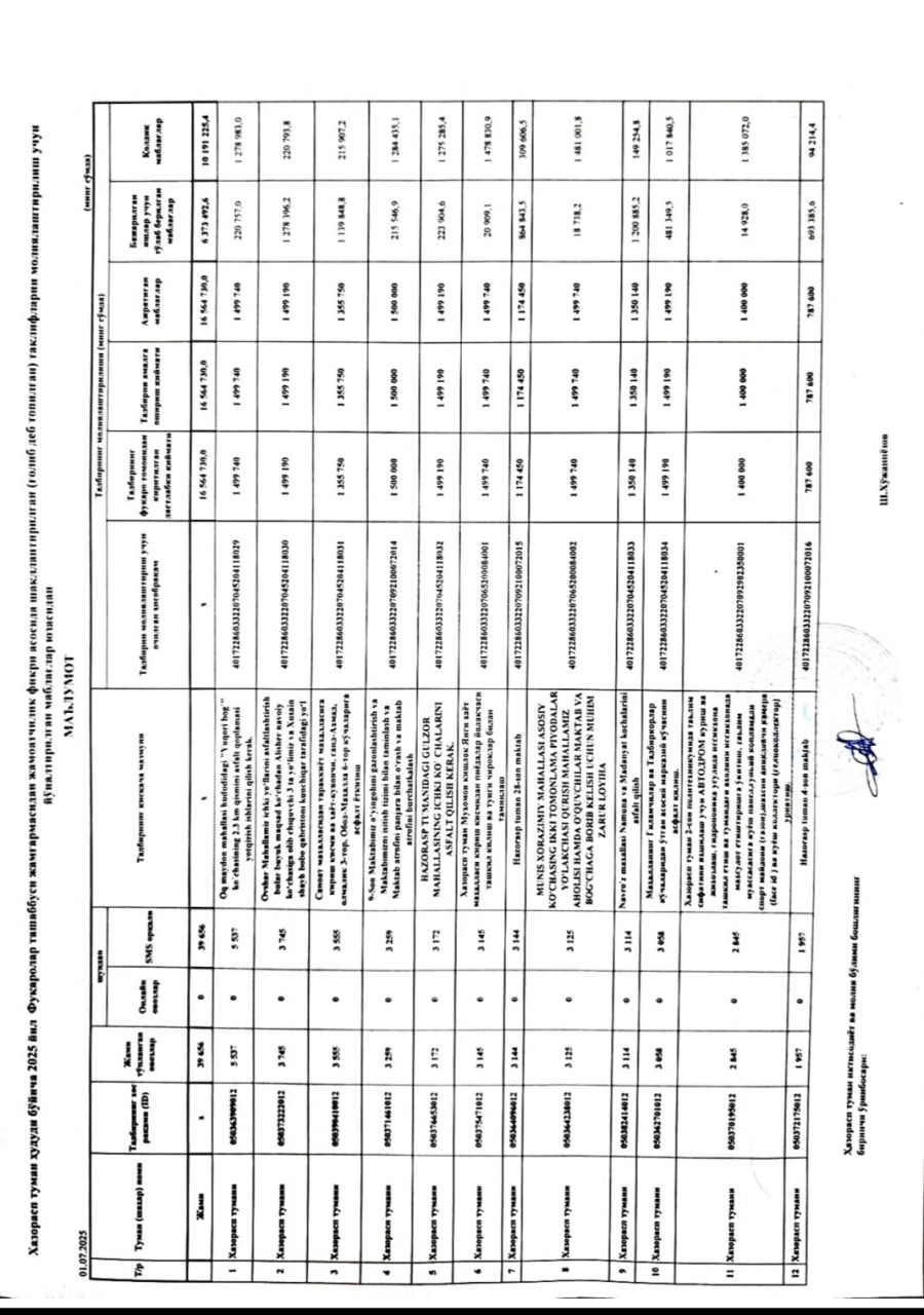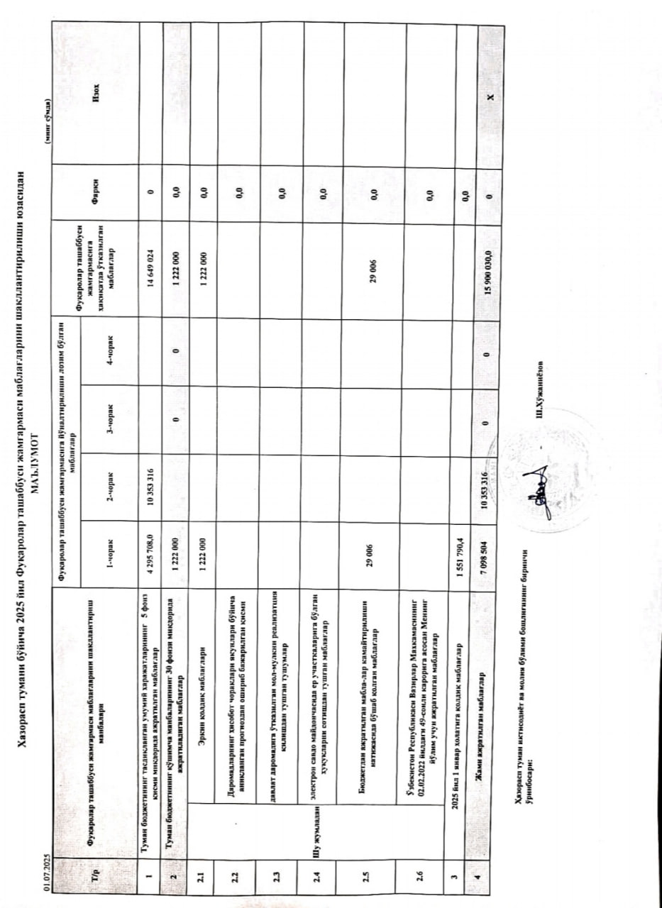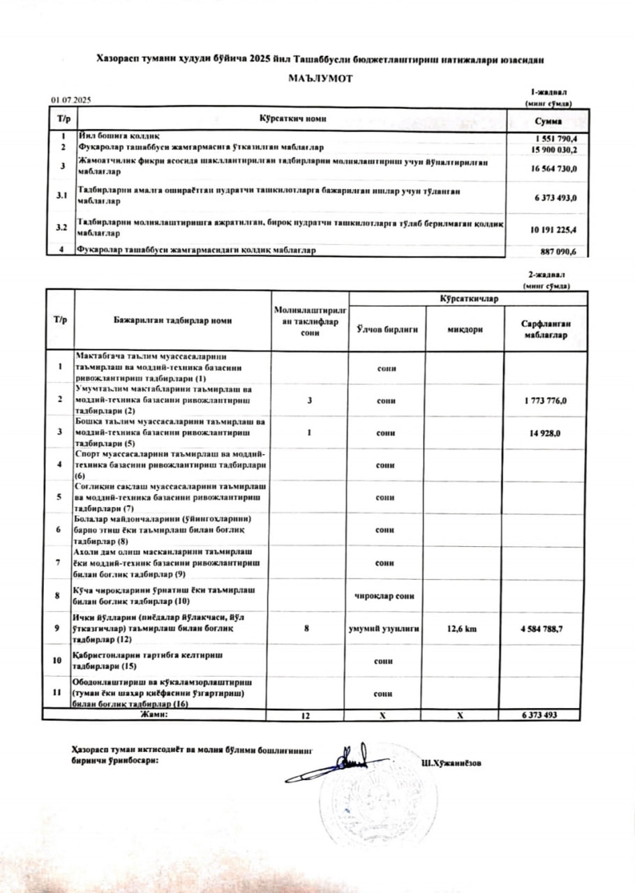 Hazorasp tumani bo‘yicha "Tashabbusli byudjet" jarayonining 2025-yil ll-chorak mablag‘lari yo‘naltirilishi va sarflanishi bo‘yicha hisobot