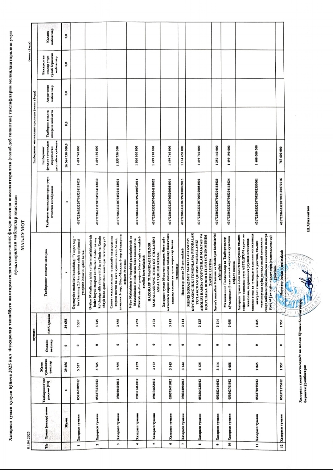 Ҳазорасп тумани ҳудуди бўйича 2025 йил 1-чорак Ташаббусли бюджетлаштириш натижалари юзасидан маълумот.